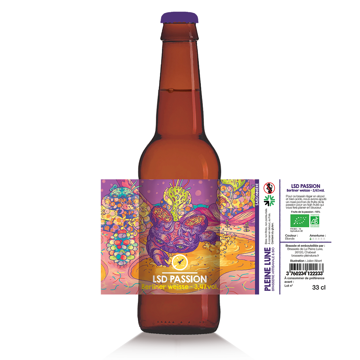 Pour ce brassin léger en alcool et bien acide, nous avons ajouté un maxi pochon de fruits de la passion pour un high fruité qui vous fera planer en douceur. LSD est une gamme de bières acides éphémères qui vous en fera voir de toutes les couleurs…